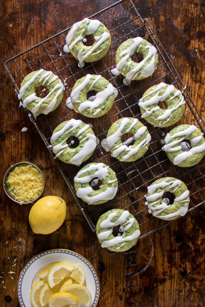 These baked lemon spinach doughnuts are bright green, but taste just like lemon donuts.