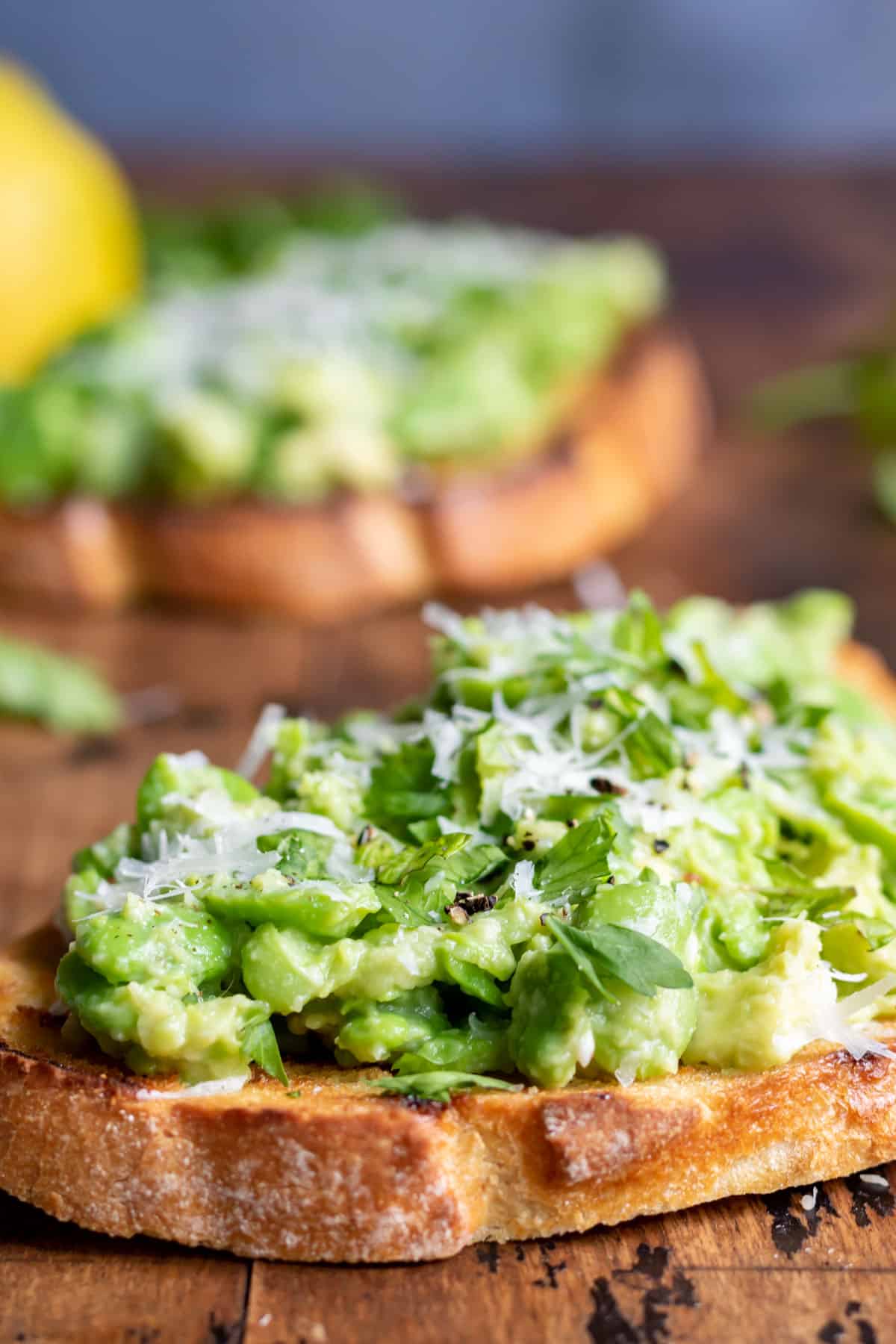 Make the topping: Add the broad beans, avocado, lemon juice, and pecorino into a bowl and lightly mash with a fork until a chunky texture is formed.