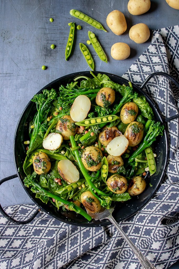 Rather than just leaves in a green salad, I love creating salads that are a mix of hot and cold foods and burst with flavour! A base of spinach is topped with Tenderstem broccoli (aka broccolini), raw peas and sprouted lentils. Then it's crowned with grilled garlic and herb potatoes.