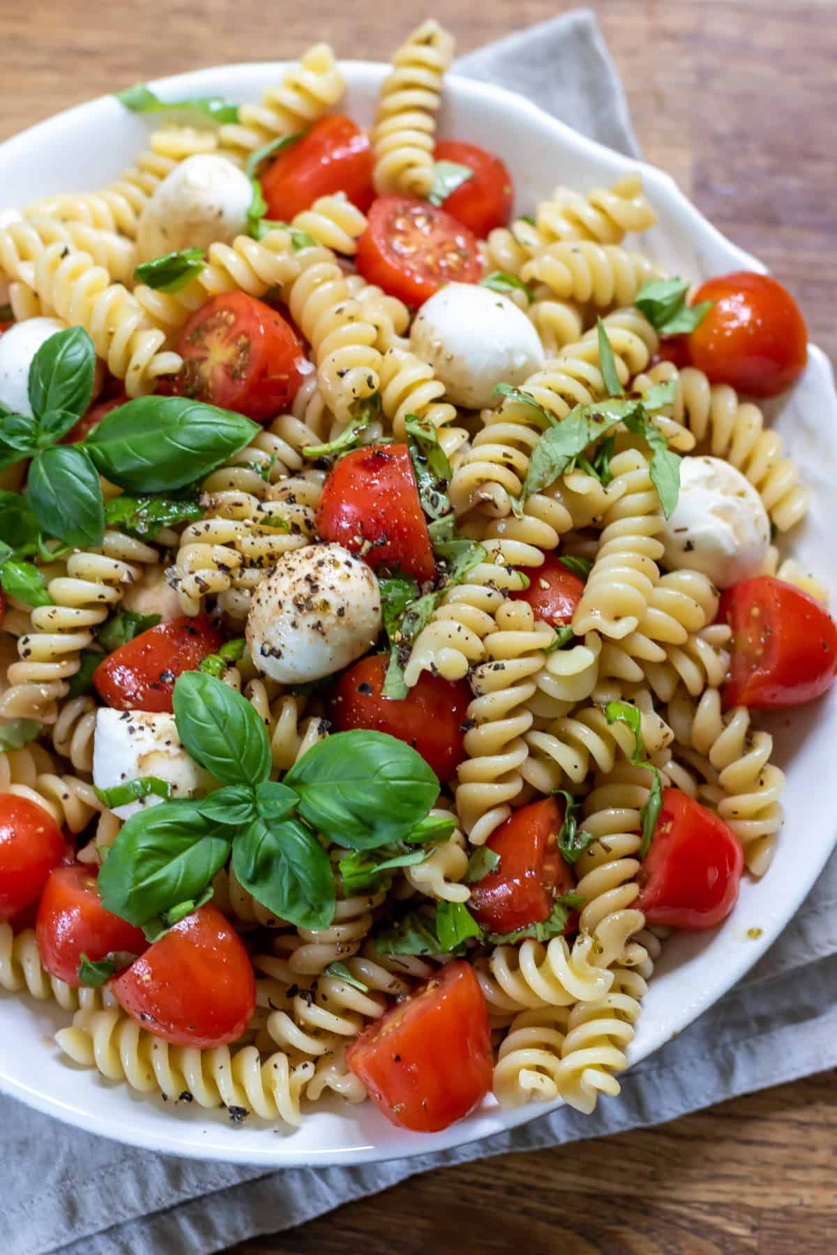 Caprese pasta salad is a great way to use in-season tomatoes and basil during the summer months.