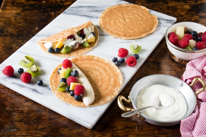 These fruit tacos are sooo easy to make. If you're short on time, you could use pre-made crepes, though I love making them with my kids. My daughter in particular loves to help with the cooking, so pancakes and crepes are a staple in our house.