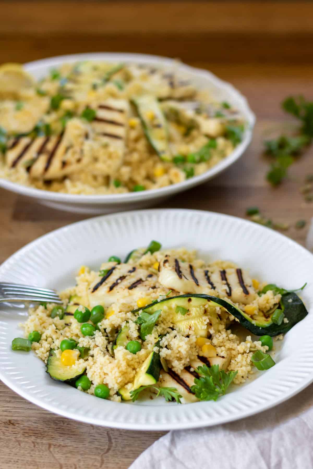 This halloumi couscous salad is made with crunchy corn, sweet peas, and grilled zucchini. The addition of Halloumi cheese gives it a nice salty flavor and grilled, charred taste.