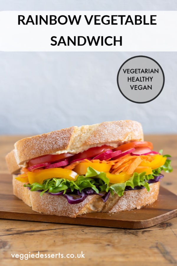This Rainbow vegetable sandwich is spread with creamy hummus, then filled with layers of crunchy raw vegetables. It is healthy, vegan, vegetarian, and tasty! Plus, it's great for picnics, lunches, and light dinners too. Endlessly adaptable to your personal tastes.