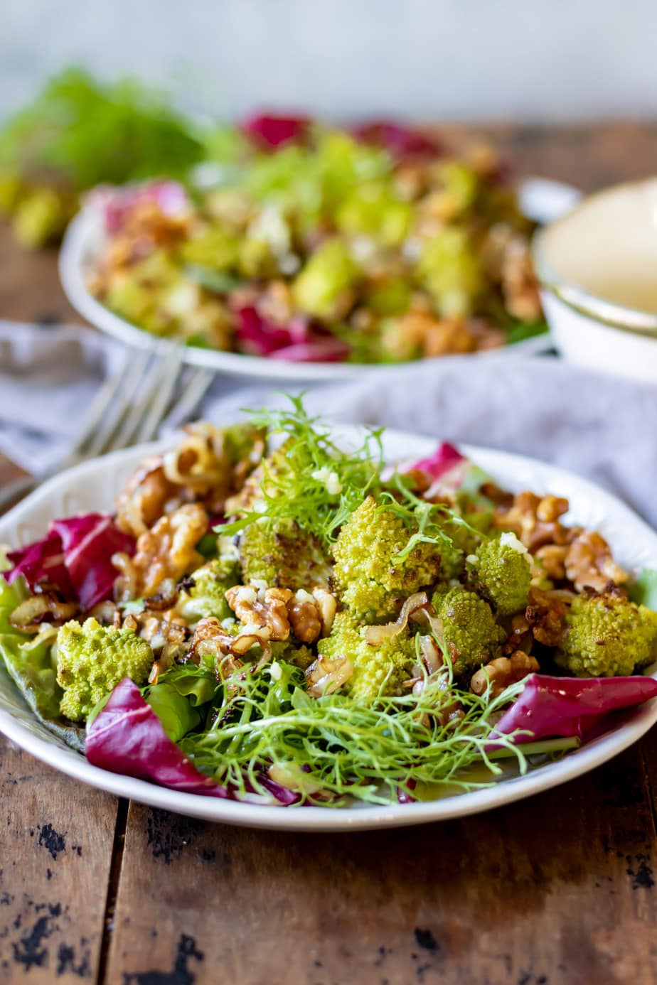 In this tasty vegan salad, Roasted Romanesco is served with lettuce, toasted walnuts, fried crispy shallots and a zingy lemon and garlic vinaigrette.