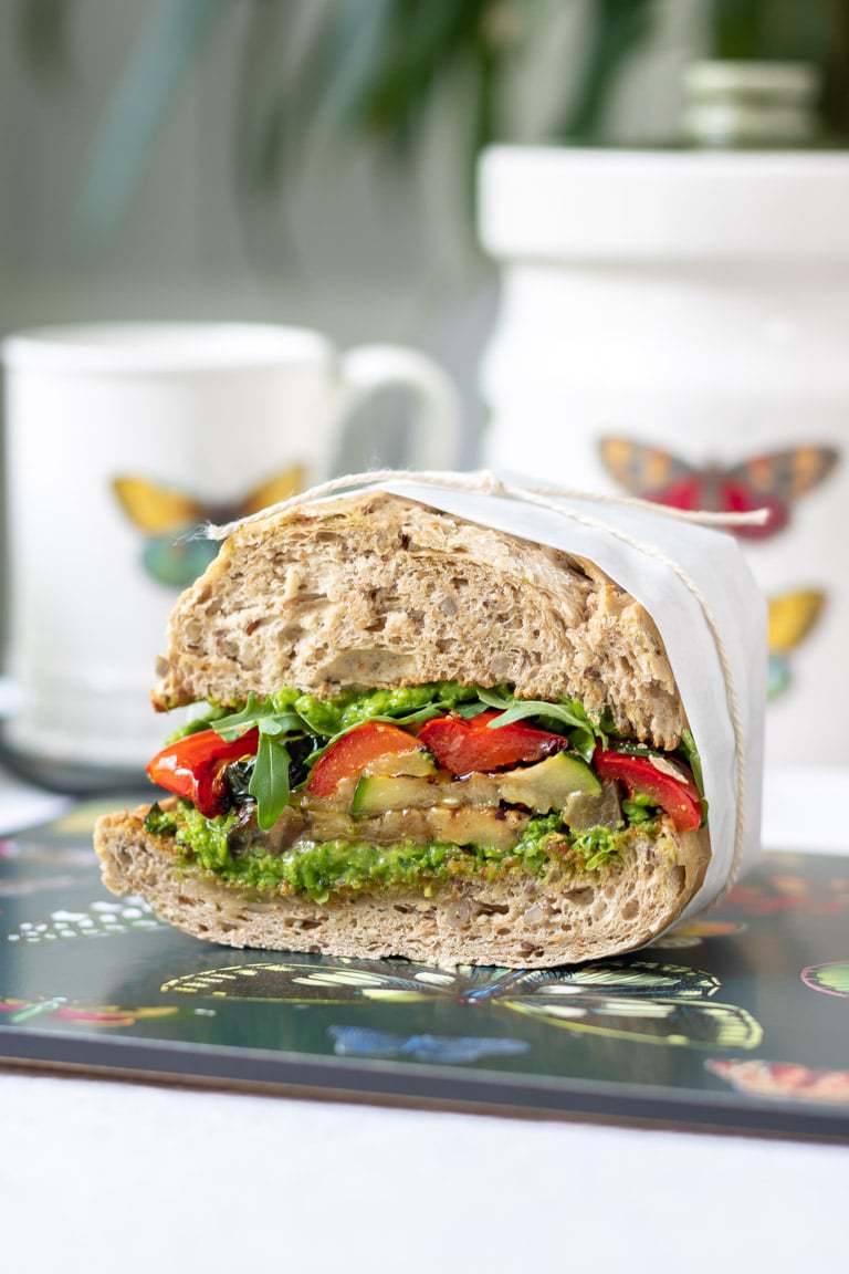 This roasted vegetable sandwich is delicious, and the quick pea pesto gives it an extra awesome taste. It's perfect for a picnic or lunch. Easy, vegan and vegetarian. Make it in the oven or on the grill.