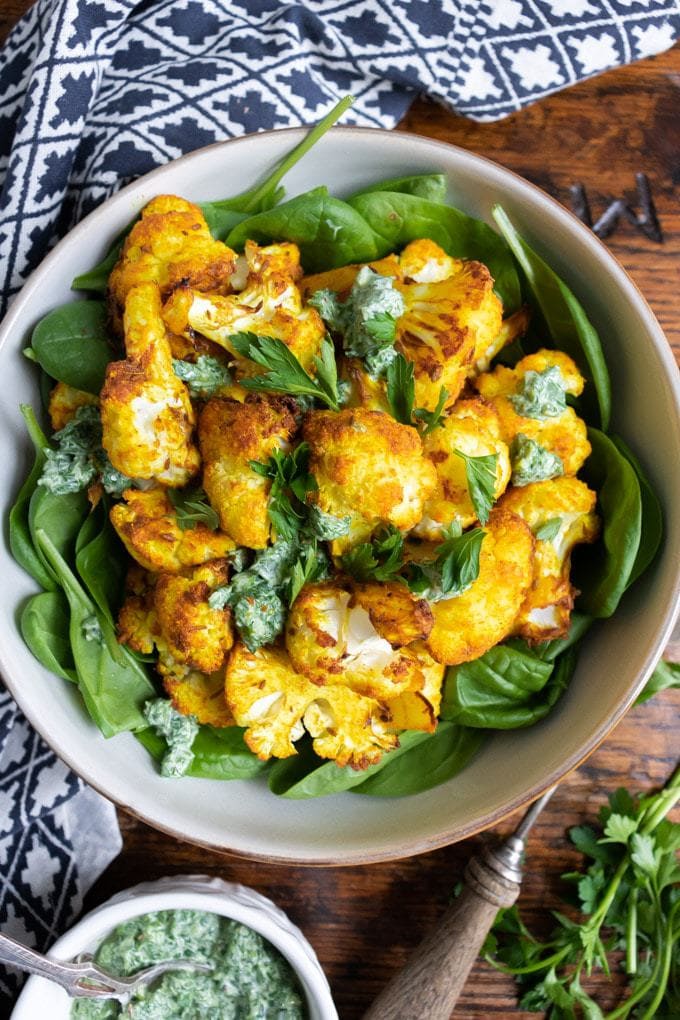 Add the spinach to a large bowl, then top with the roasted cauliflower and dollop on the herb dressing. Enjoy warm or cold.
