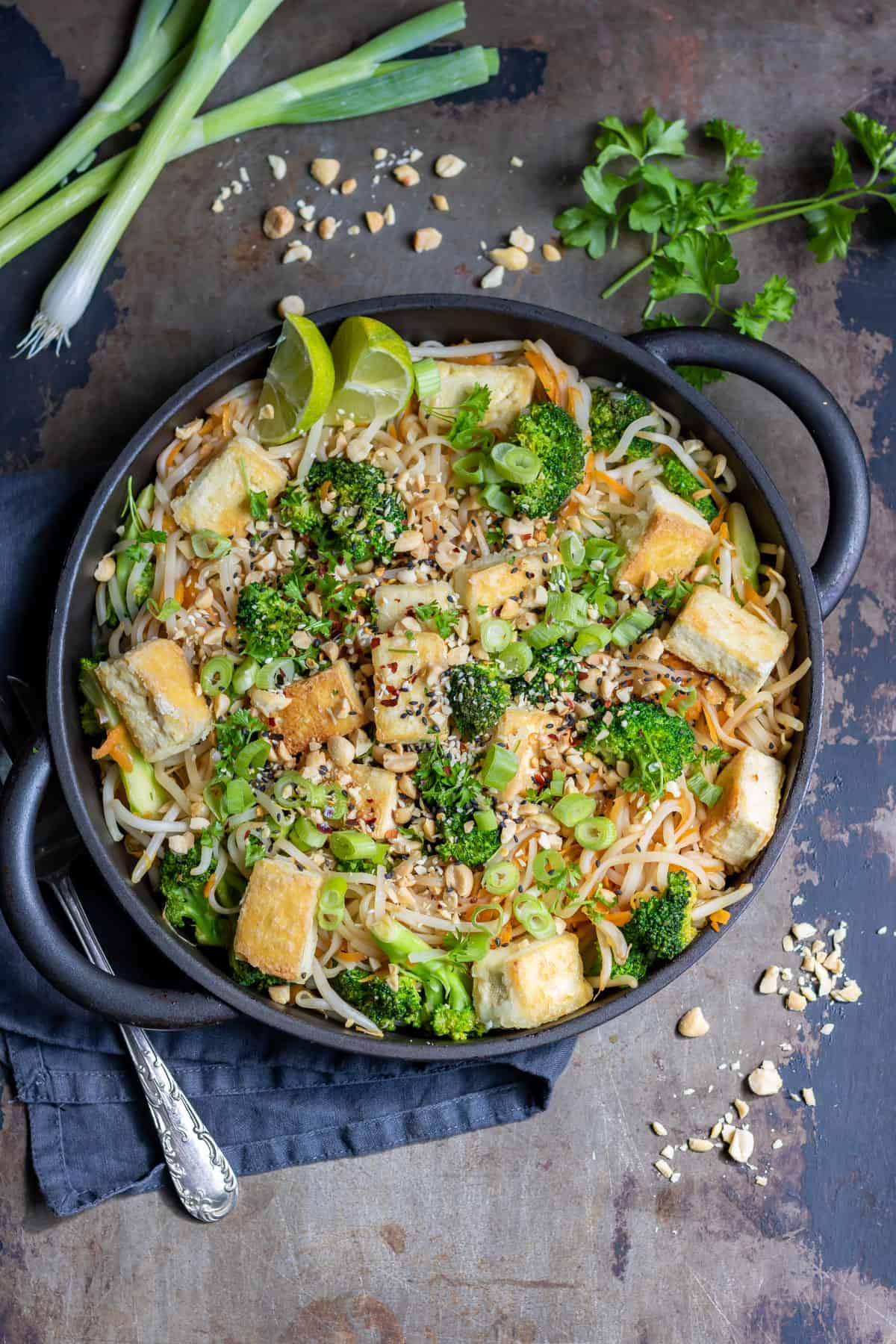 This tasty vegan Pad Thai is ready in just 15 minutes! It's full of flavor and fresh veggies, noodles, and tamarind sauce, plus a little chili kick and crunchy peanuts.