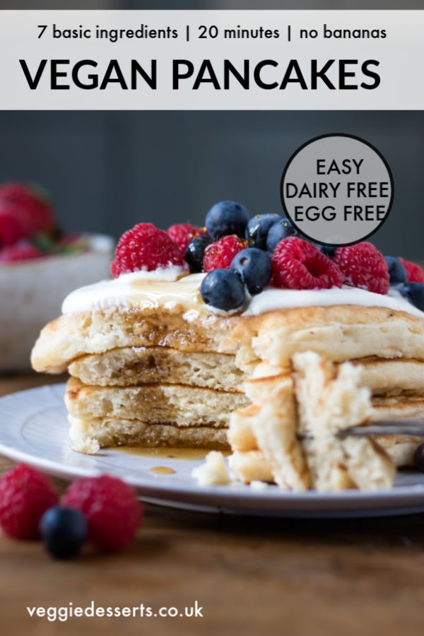 These vegan pancakes are light, fluffy and have no unusual ingredients. No banana, no flax. Just 7 basic ingredients and 20 minutes. They're quick, easy and delicious. Tasty dairy free and eggless pancakes.