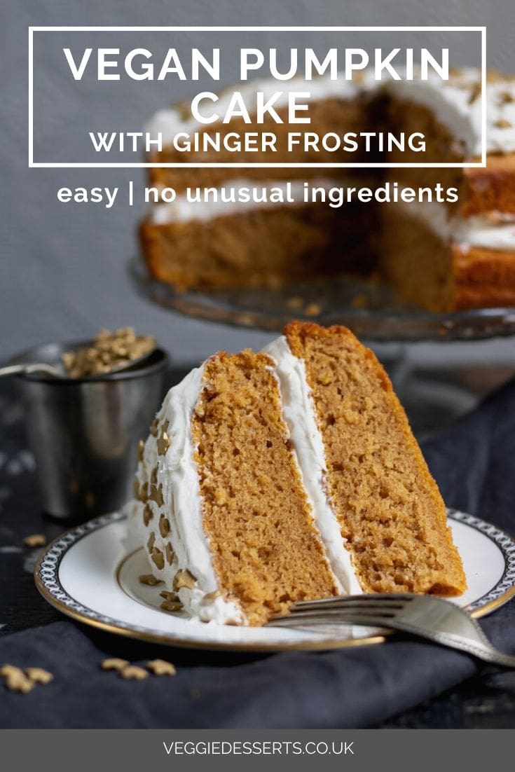You don't need any unusual ingredients (no chia, banana, or flax), just typical kitchen ingredients that all come together into a beautifully-spiced, moist vegan pumpkin cake with ginger frosting.