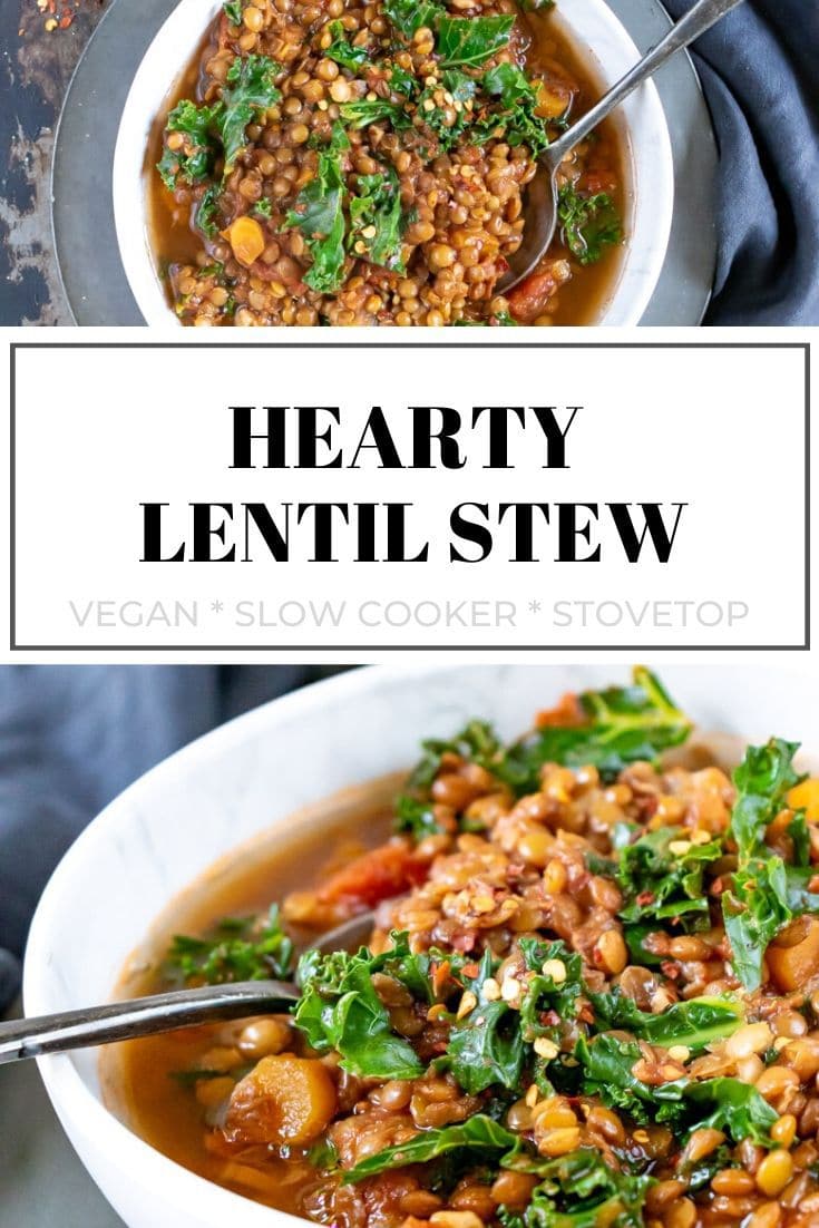 This slow cooker or stovetop Lentil Stew will warm you up on cold evenings. It's easy, hearty and bursting with vegetables and great taste. Optional harissa paste gives a lovely depth of warm flavor. Vegan and gluten-free.