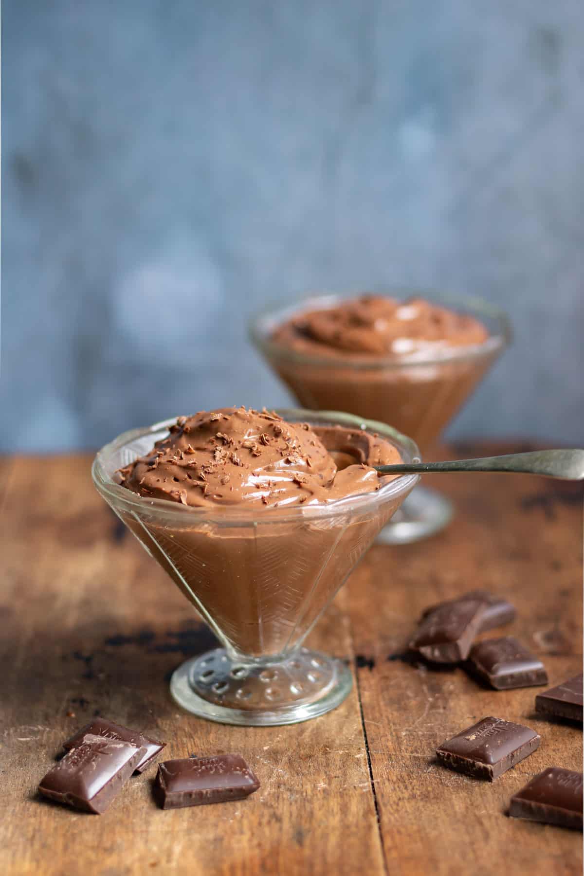Assemble and serve: Divide the chocolate mousse into 2-4 serving dishes. Chill in the fridge for at least one hour before garnishing with chocolate shavings, whipped cream, or fruit. Serve cold.